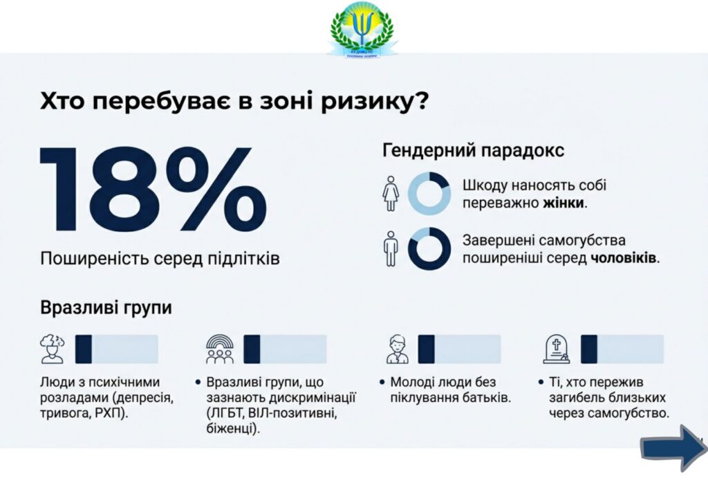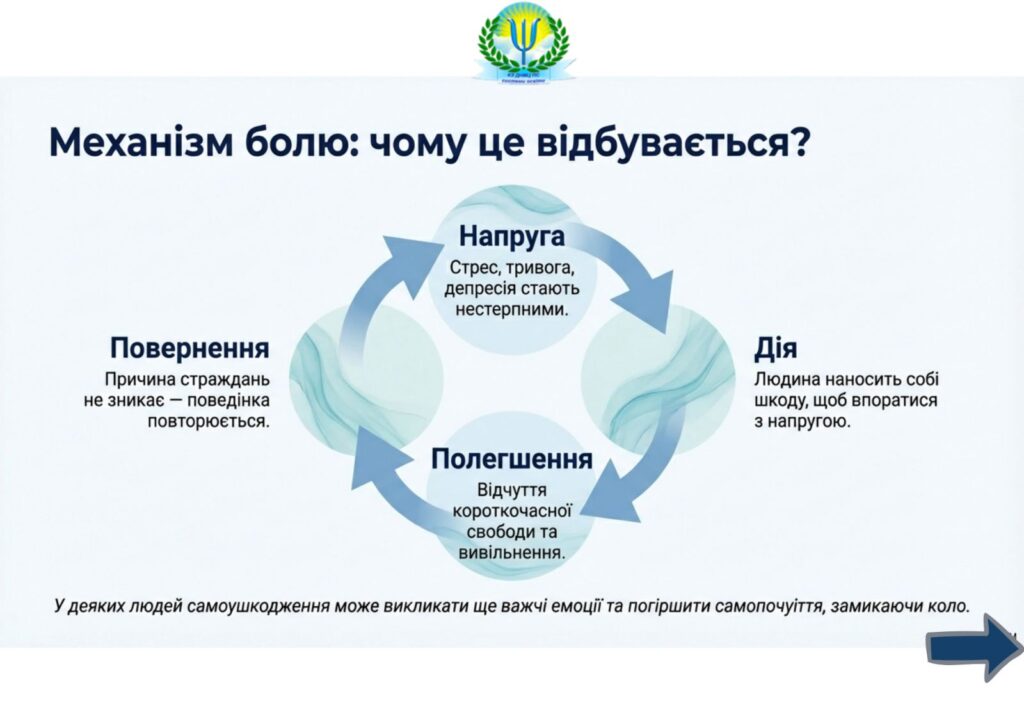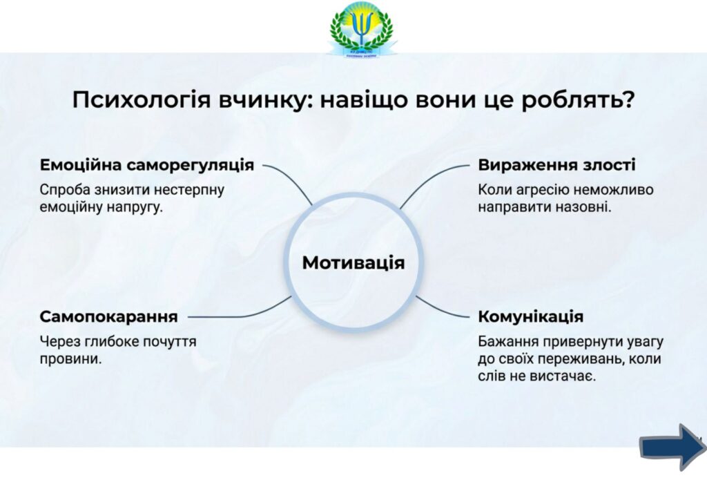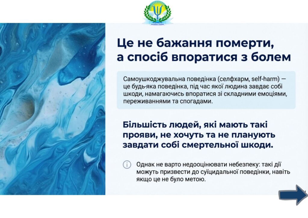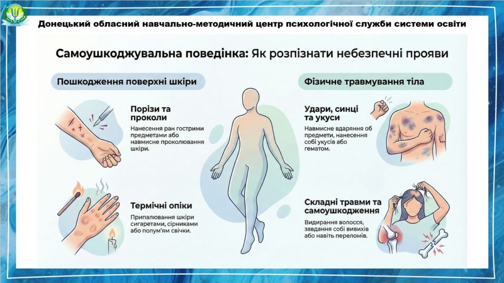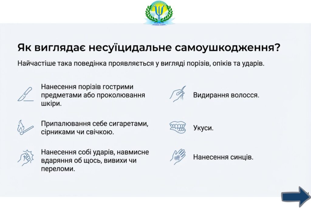 Самоушкодження – це навмисне заподіяння собі фізичної шкоди, критична ознака емоційного розладу. Більшість людей, які наносять собі порізи, проколювання шкіри, удари, укуси, припалюють себе сигаретами тощо, не хочуть та не планують завдати собі смертельної шкоди. Однак не варто недооцінювати небезпеку від таких дій, адже самоушкодження може призвести й до суїцидальної поведінки.