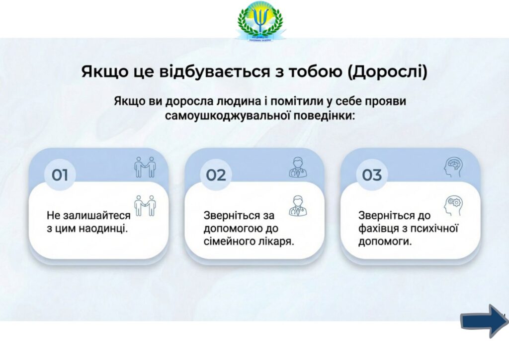 Якщо ви доросла людина, то у разі появи у вас самоушкоджувальної поведінки, зверніться за допомогою до сімейного лікаря або до фахівця з психічної допомоги.