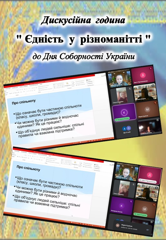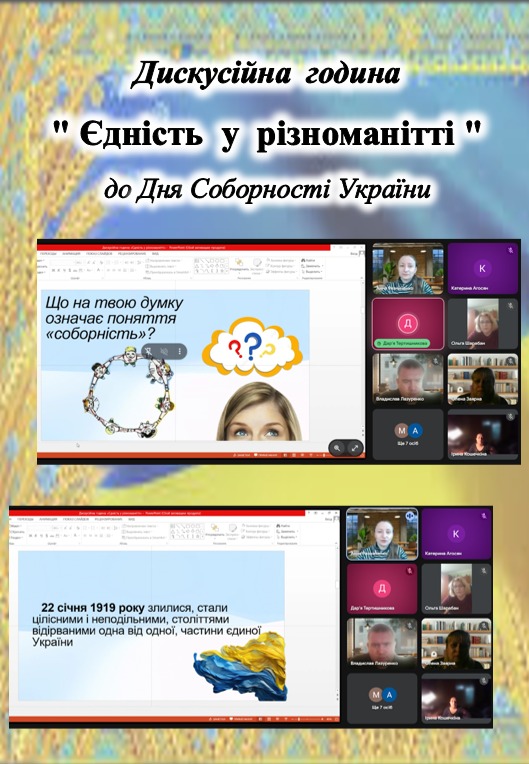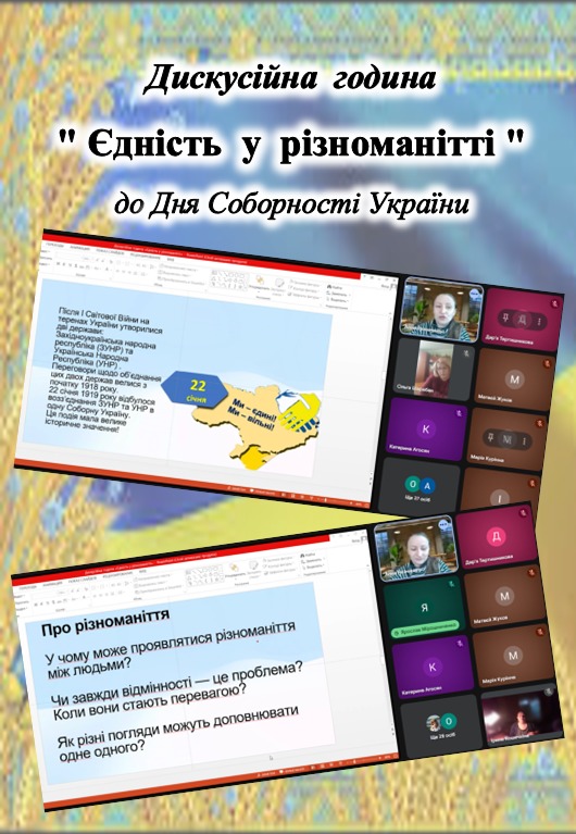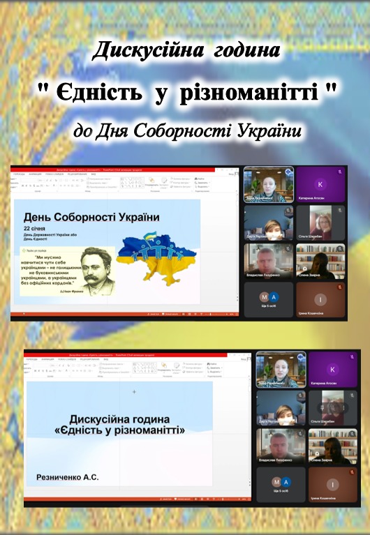 До Дня Соборності України в Слов’янському ЗЗСО № 8 відбулася дискусійна година «Єдність у різноманітті» для учнів 9–11 класів, яку провела вчитель історії та правознавства Резниченко А.С. Захід був присвячений осмисленню ідеї соборності як фундаментальної цінності української державності та суспільства.