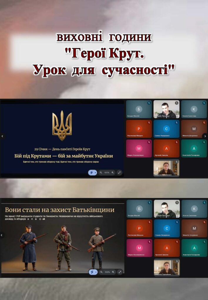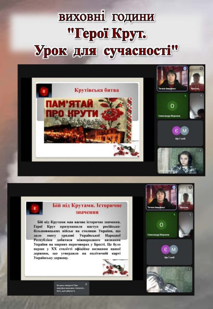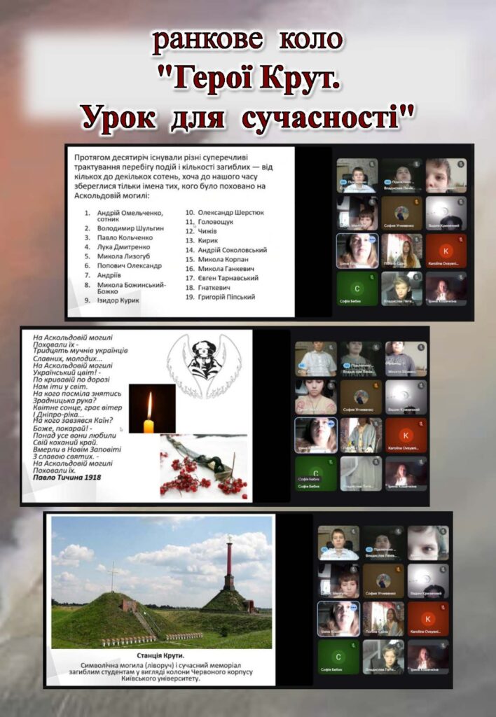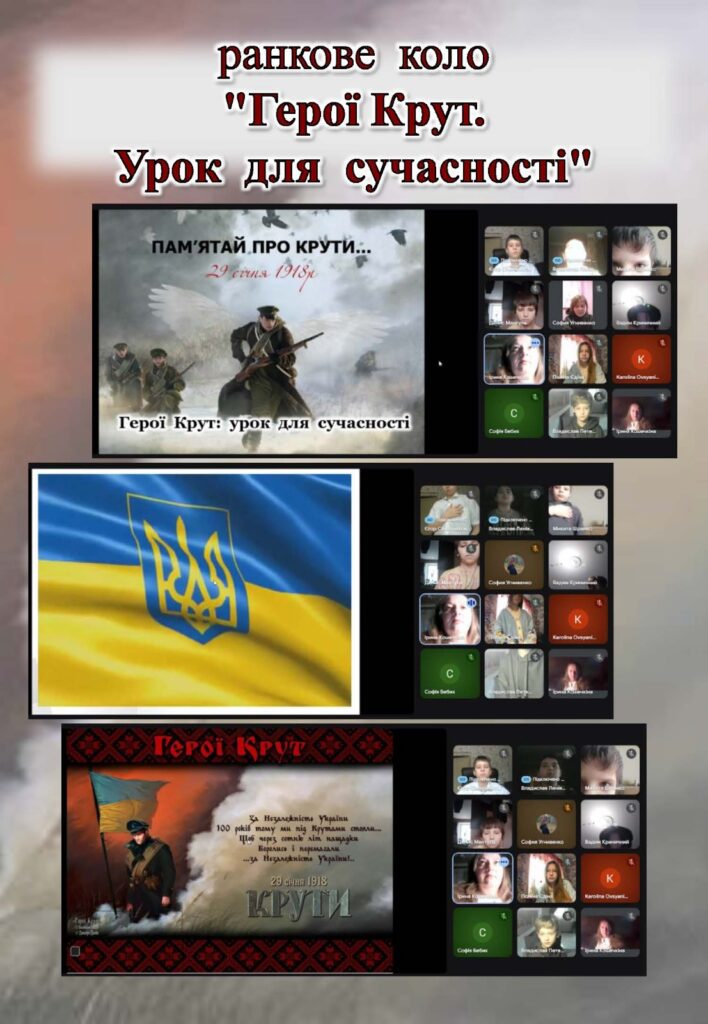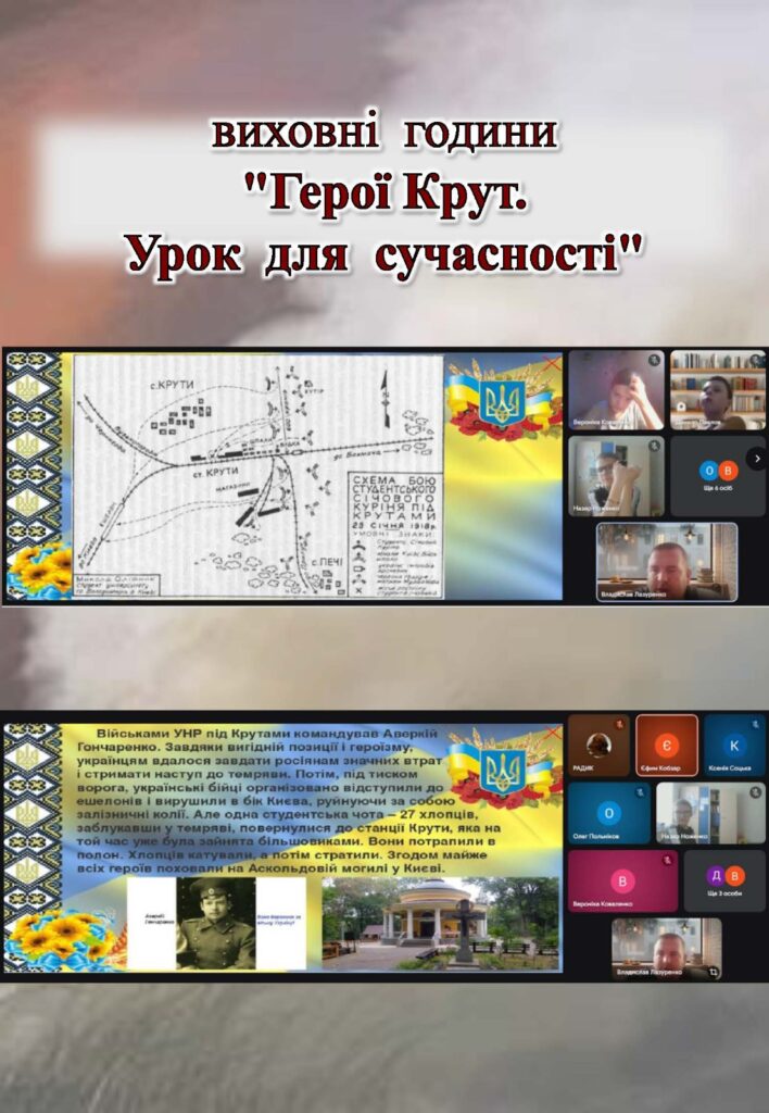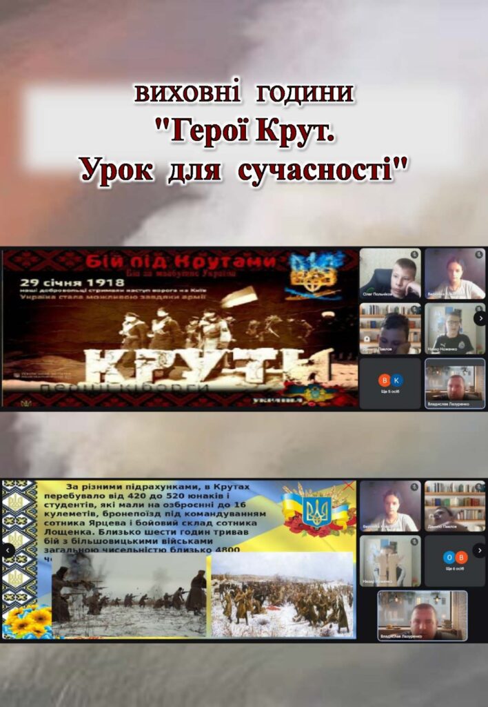 💙 💙 До Дня пам’яті Героїв Крут у нашому закладі освіти були проведені виховні години для здобувачів освіти 6-11 класів та ранкові зустрічі для учнів 3-5 класів «Герої Крут: урок для сучасності». Під час заходів учні пригадали події січня 1918 року, актуалізували свої знання про подвиг українських юнаків, які ціною власного життя стали на захист майбутнього держави.