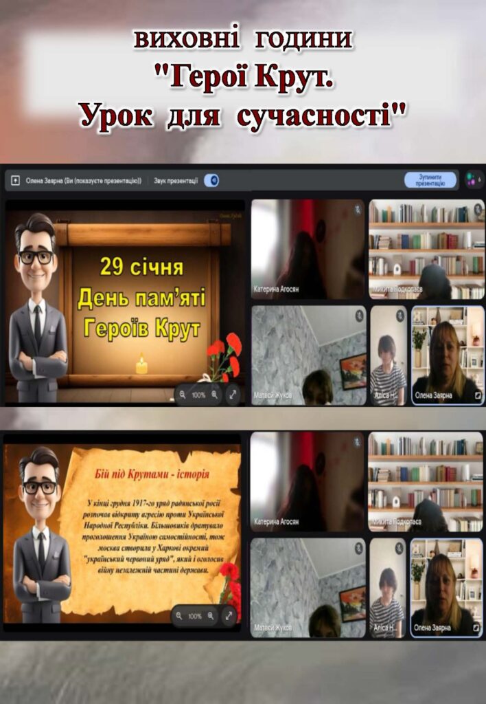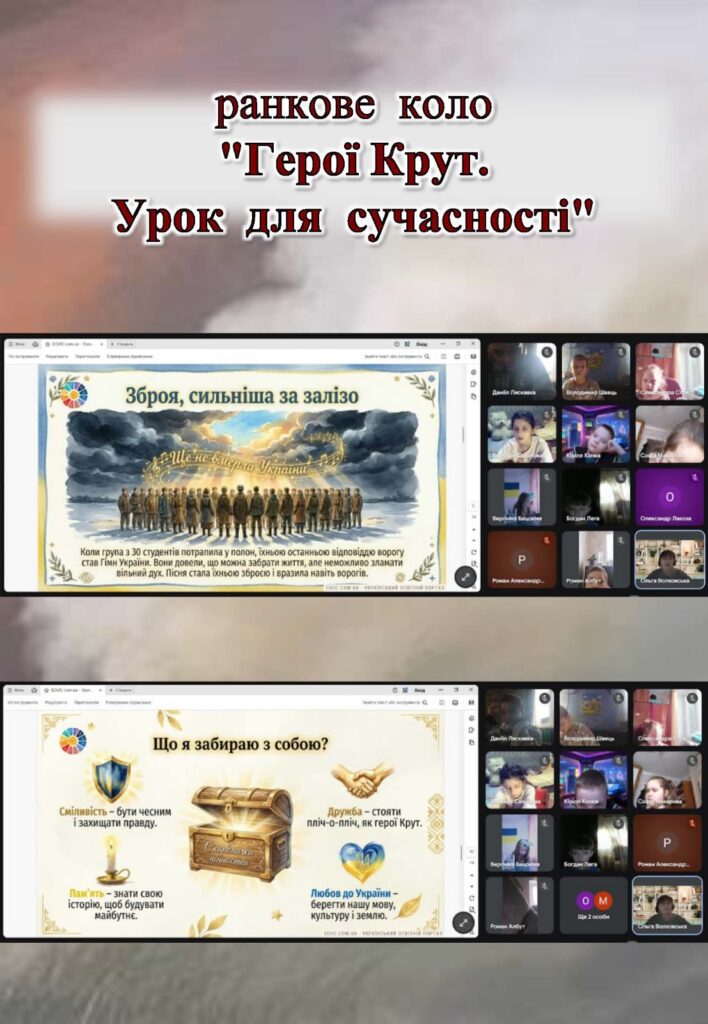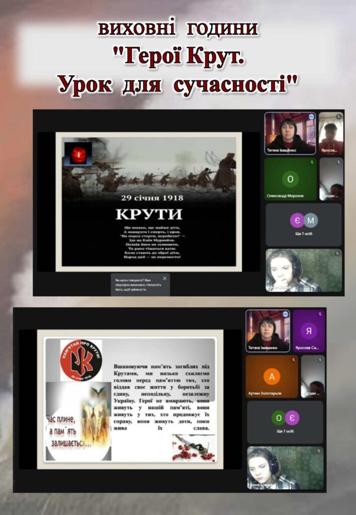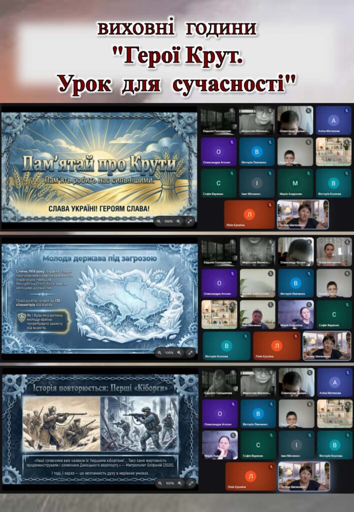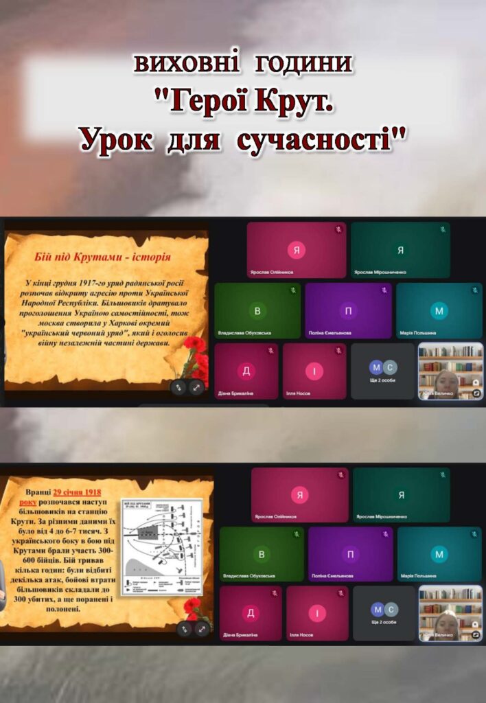 💙 💙 До Дня пам’яті Героїв Крут у нашому закладі освіти були проведені виховні години для здобувачів освіти 6-11 класів та ранкові зустрічі для учнів 3-5 класів «Герої Крут: урок для сучасності». Під час заходів учні пригадали події січня 1918 року, актуалізували свої знання про подвиг українських юнаків, які ціною власного життя стали на захист майбутнього держави.