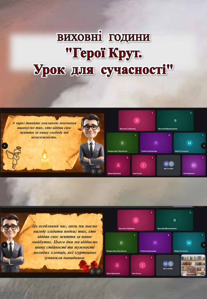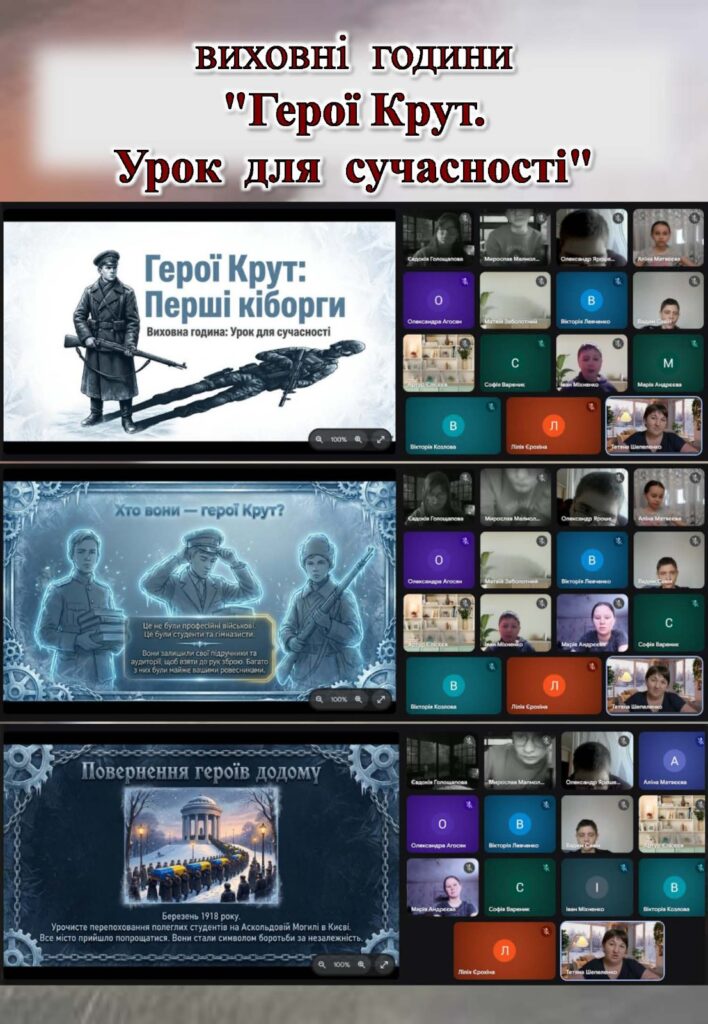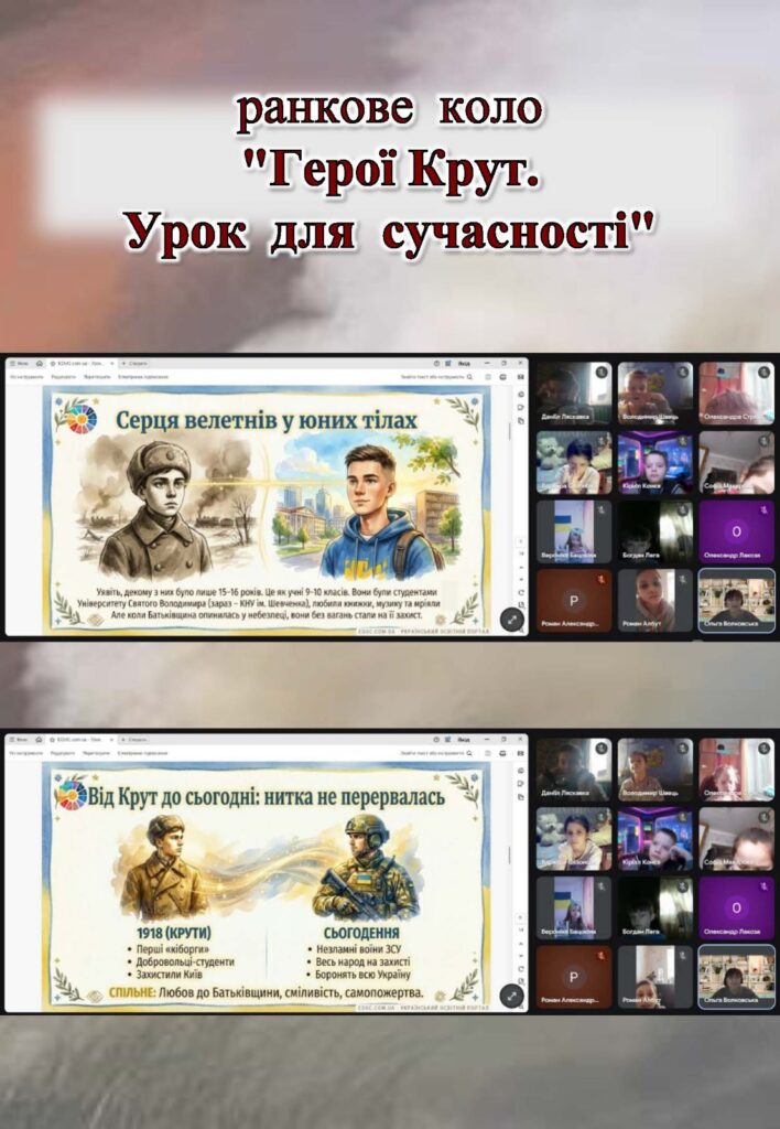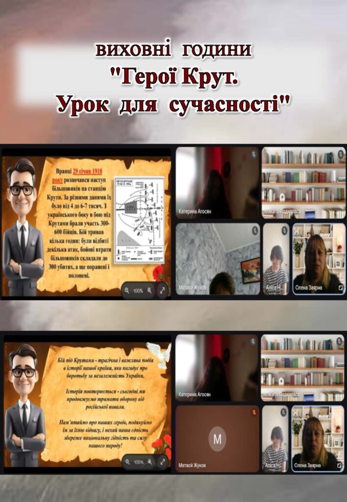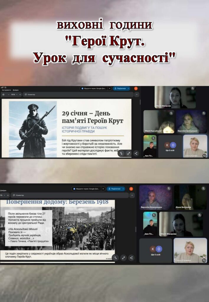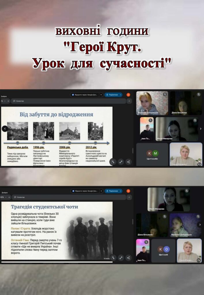 💙 💙 До Дня пам’яті Героїв Крут у нашому закладі освіти були проведені виховні години для здобувачів освіти 6-11 класів та ранкові зустрічі для учнів 3-5 класів «Герої Крут: урок для сучасності». Під час заходів учні пригадали події січня 1918 року, актуалізували свої знання про подвиг українських юнаків, які ціною власного життя стали на захист майбутнього держави.