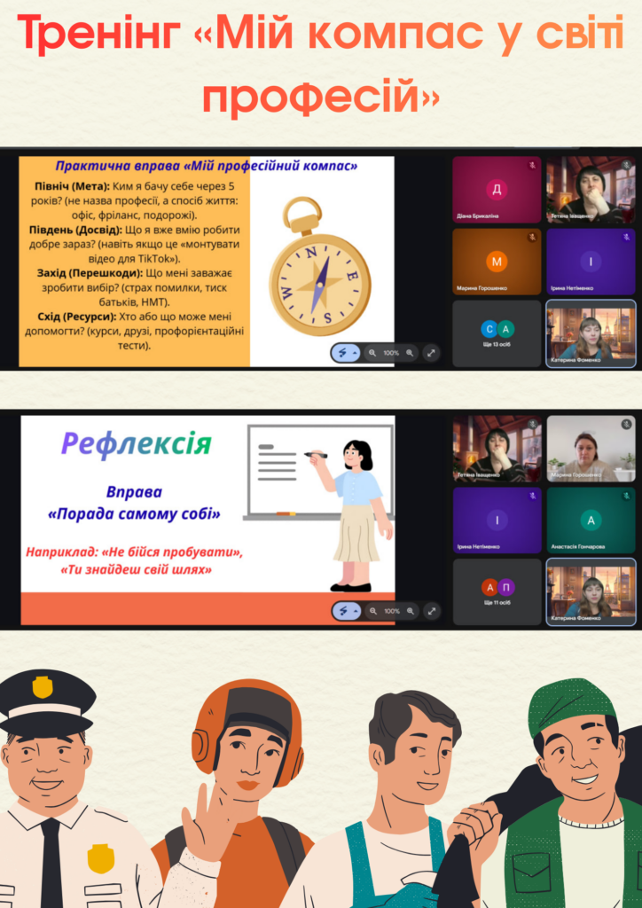 - Практична вправа «Мій професійний компас». Старшокласники проаналізували свої цілі на 5 років («Північ»), наявний досвід («Південь»), внутрішні перешкоди та страхи («Захід») і ресурси, що можуть допомогти («Схід»).