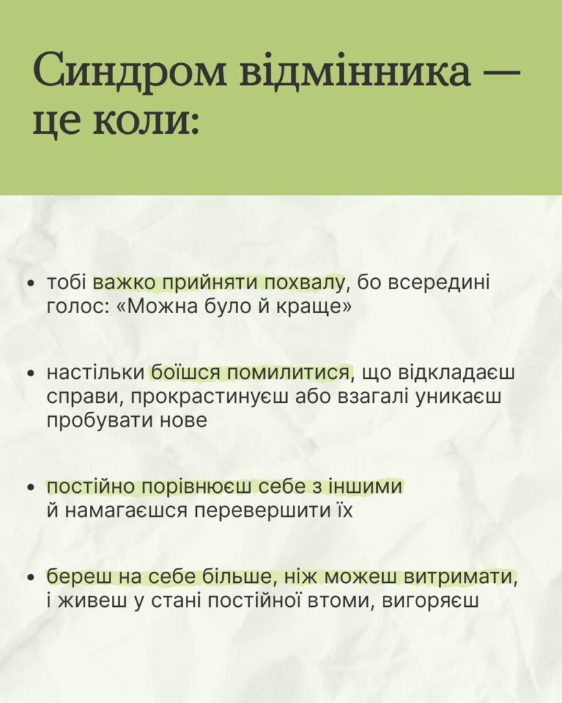 Синдром відмінника 24.09.2025 Ти як? Багато робиш, але здається, в інших все одно краще? 🙃 Гортай карусель, щоб перевірити, чи не синдром відмінника це 👉