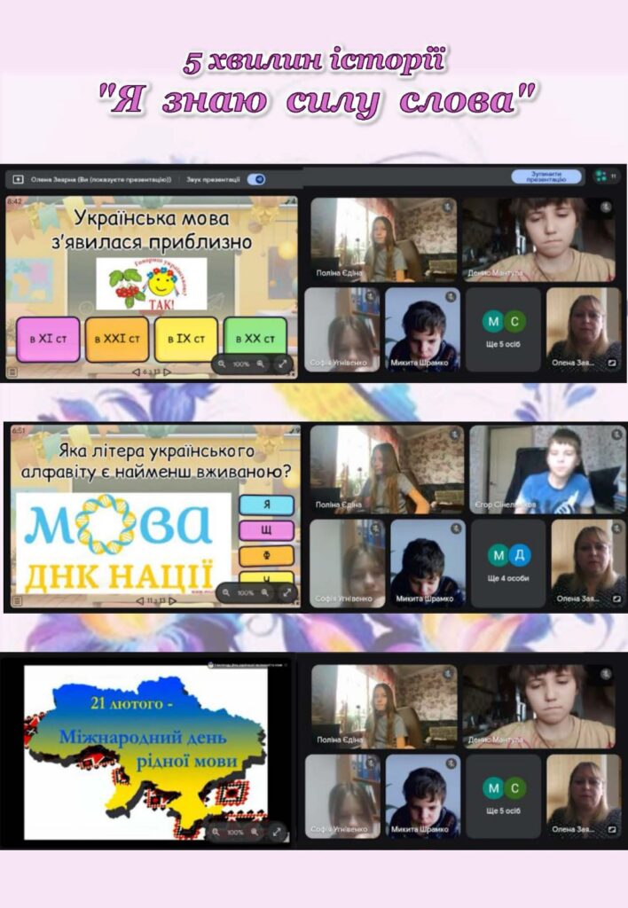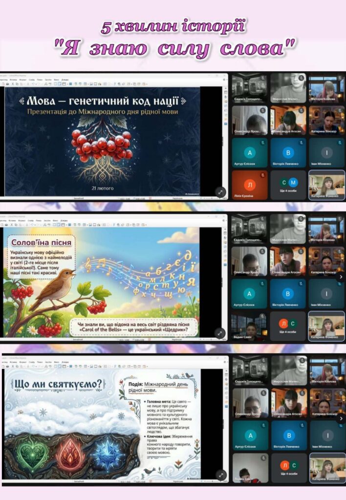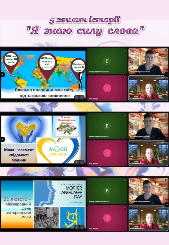 До Міжнародного дня рідної мови вчителі ЗЗСО № 8 провели тематичні інформаційні хвилинки «5 хвилин історії: Я знаю силу слова». Педагоги інтегрували мовознавчі та культурні аспекти у зміст навчальних предметів, підкресливши роль мови як фундаменту національної ідентичності та духовної спадщини.